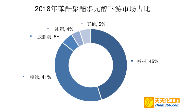 2018年中國苯酐聚酯多元醇的下游市場主要用于板材,占到46%;其次是噴涂,占到41%。從近三年的發(fā)展趨勢來看,板材與噴涂市場占比仍屬于小幅增長。