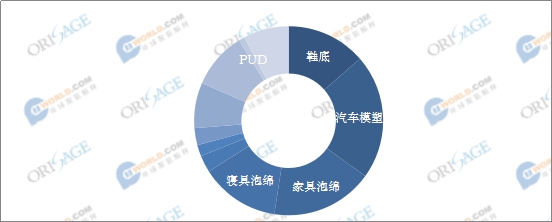 由于全MDI體系高反應活性,低VOC排放等優(yōu)異性能,越來越受到市場重視,但MDI加工便利度不佳,因此MDI預聚體應運而生。依據(jù)配方調制完成后,下游可直接注入模具等使用。MDI預聚體的下游應用領域廣泛,其中汽車模塑、家具寢具泡棉、鞋底以及彈性體、膠黏劑等CASE領域占比較大,具體可參見圖表3。