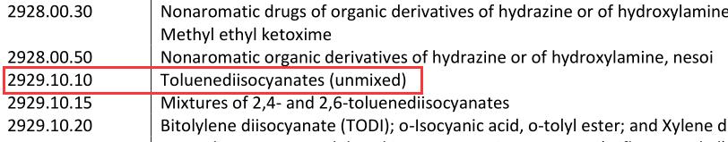 在中美雙方進(jìn)口商品稅率調(diào)整清單里(如上圖),在稅則號(hào)29291010下的甲苯二異氰酸酯(TDI)產(chǎn)品也位列其中,下面天天化工網(wǎng)簡(jiǎn)要分析一下征稅對(duì)中國(guó)TDI進(jìn)出口的影響。