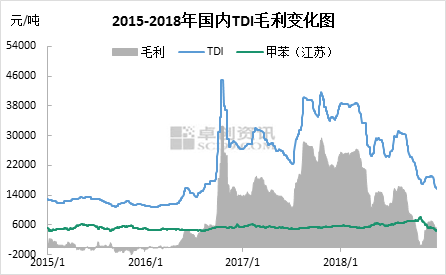 而反觀TDI的盈利情況,如上圖,受惠于原料甲苯價(jià)格的持續(xù)下跌,雖然TDI自身價(jià)格跌至2016年8月份以來(lái)的最低點(diǎn),但盈利尚可。原料甲苯走勢(shì)與國(guó)際原油息息相關(guān),而國(guó)際原油短期內(nèi)或許維持疲弱狀態(tài),因此可以預(yù)見(jiàn)甲苯價(jià)格或重回低迷。在TDI自身價(jià)格跳水的情況下,成本面同步在下行,一定程度上可以預(yù)見(jiàn)TDI的價(jià)格底部也在潛移默化調(diào)整。而短期來(lái)看,成本的下探與新增產(chǎn)能釋放,兩大利空疊加作用,TDI的價(jià)格將繼續(xù)下行尋底。