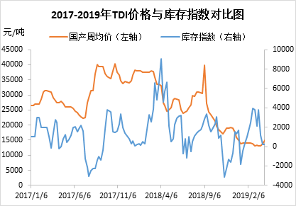 圖2 2017-2019年TDI周均價(jià)及庫(kù)存指數(shù)對(duì)比圖